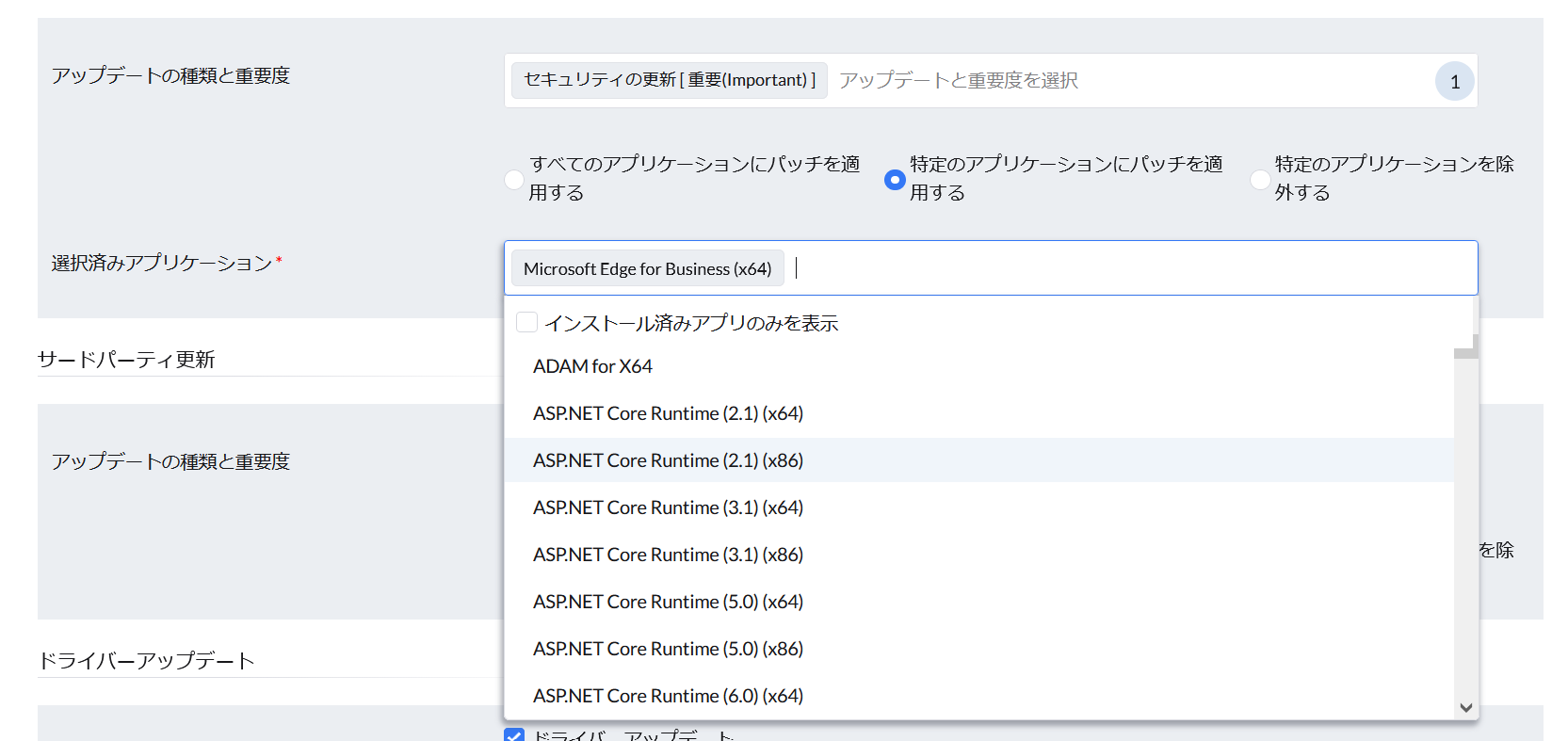 - 上記で選択した種類のパッチのうち、特定のソフトウェアのパッチのみを配布したい場合、「特定のアプリケーションにパッチを適用する」を選択します。「特定のアプリケーションを除外する」を選択することで、特定のソフトウェア以外のパッチを配布することも可能です。