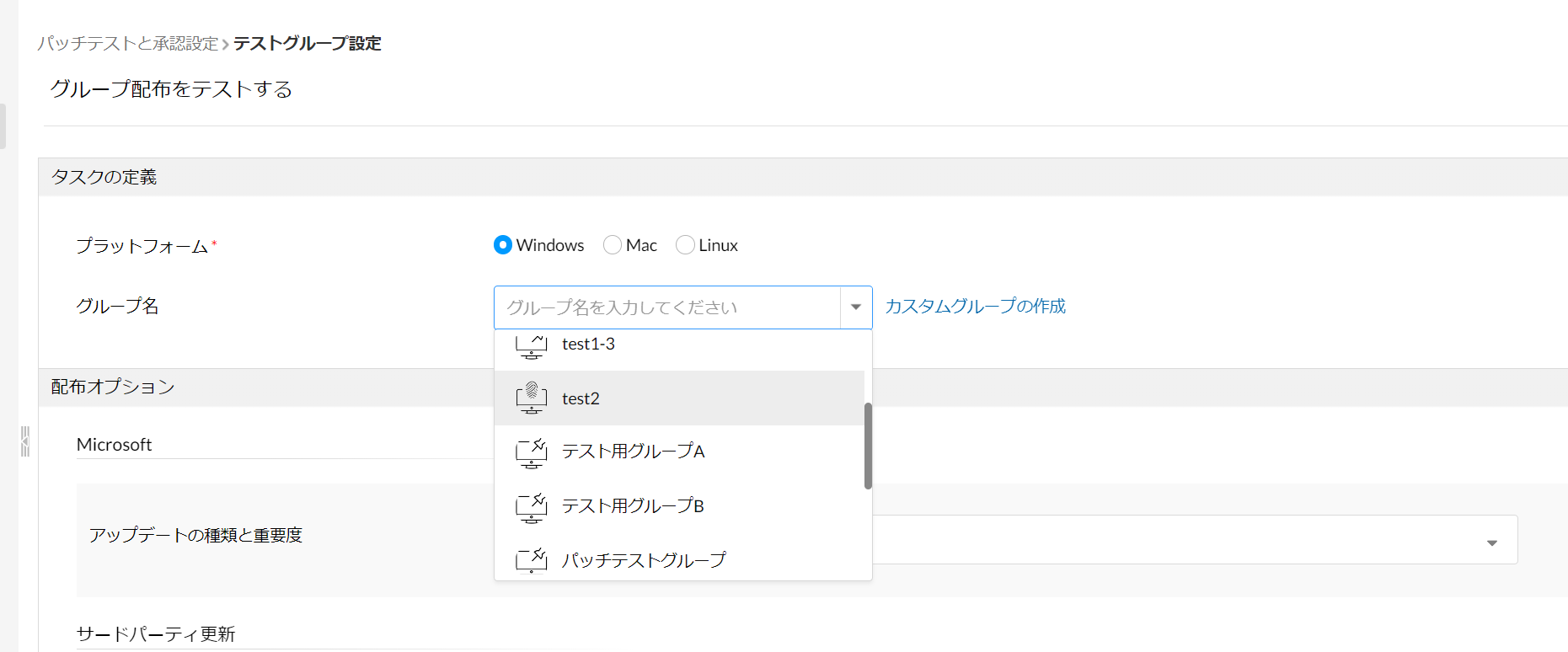 - 対象のOSを選択します。また、テストのためのグループ(必要なテスト用端末のみを所属させたグループ)として、あらかじめ作成しておいたカスタムグループを選択します(またはカスタムグループを新規作成します)。