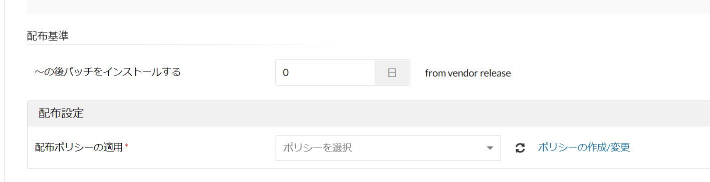 - 当機能(テスト用端末への自動配布)では、対象のパッチのうち、リリースされてから一定の日数が経過したもののみが配布されます。そのため、そのような基準となる日数(0 日も可)を入力します。なお、実際の配布は、配布ポリシーで指定した曜日・時間帯に行われます。