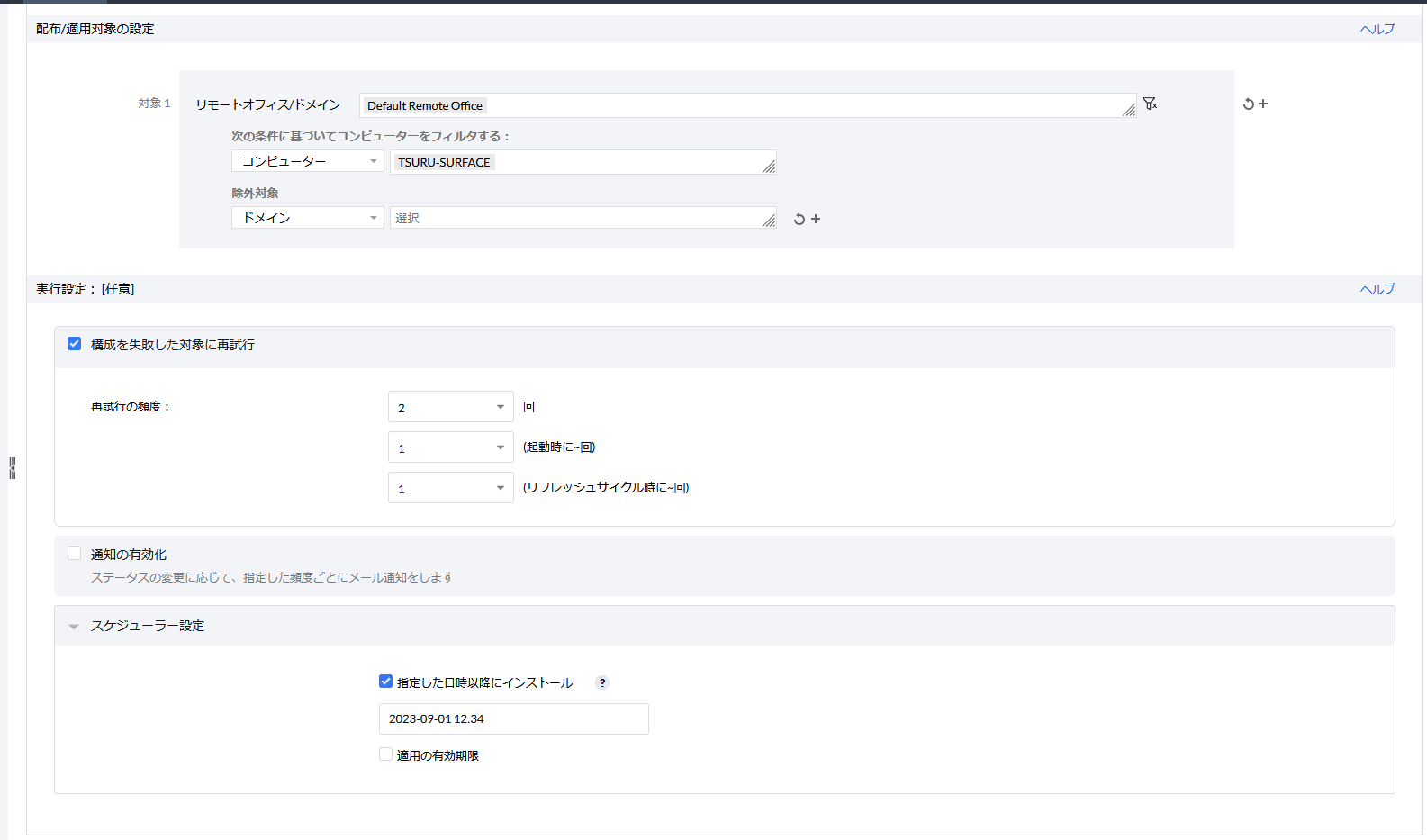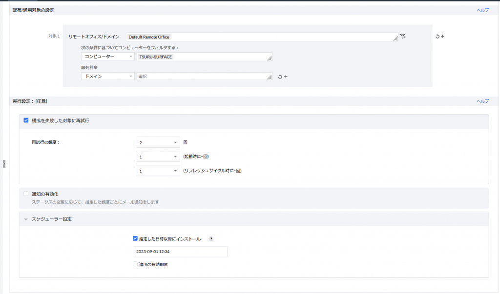 - 必要に応じて、スケジュール設定を行います。タスクの開始時刻を設定する場合は「指定した日時以降にインストール」にチェックを入れ、開始日と開始時間を入力します。タスクの有効期限を設定する場合は「適用の有効期限」にチェックを入れ、同様に終了日と終了時間を入力します。