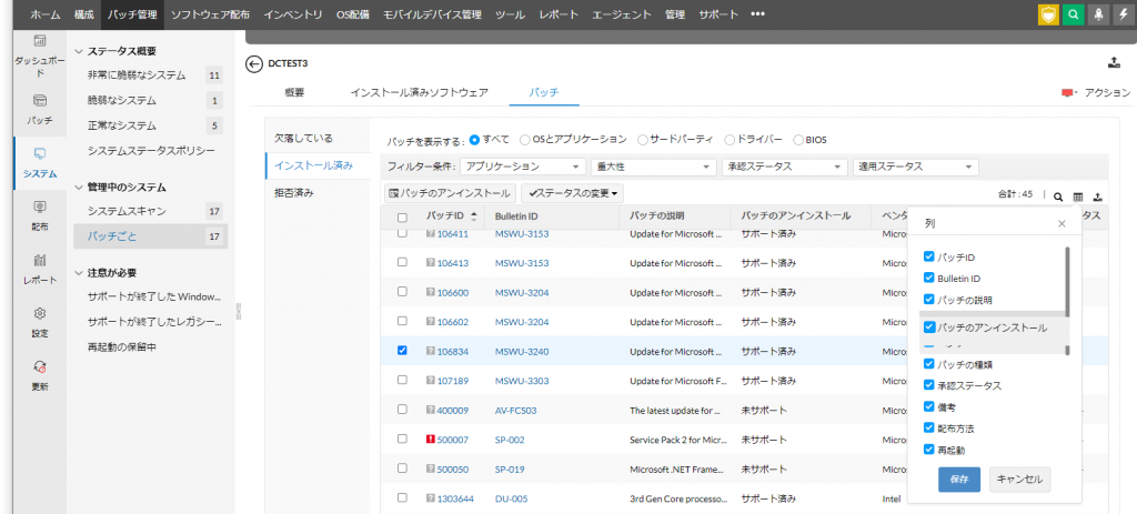 ここでは パッチ管理タブ > パッチ > インストール済みパッチ ではなく、パッチ管理タブ > パッチ > 適用可能なパッチ を開きます。