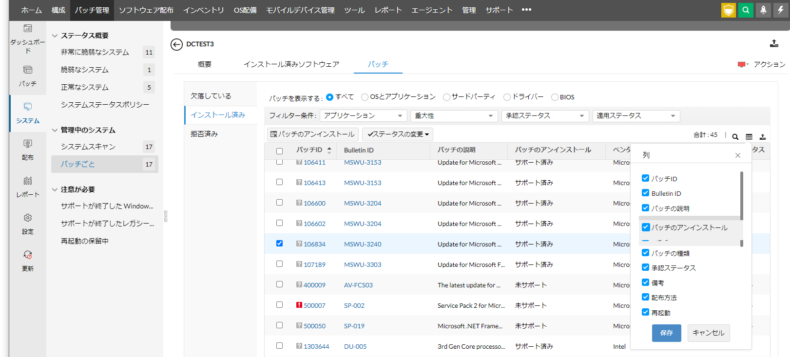 (参考Q&A:「パッチをある1台の端末に配布し、無事インストールに成功しましたが、パッチ管理タブ > パッチ > インストール済みパッチ に表示されません。」) - アンインストールしたいパッチに関して、そのパッチがアンインストールに対応していることを確認します(アンインストールの可否は、各パッチのベンダーが定めた仕様に基づきます)。リスト上で「パッチのアンインストール」列が「サポート済み」と表示されている場合、そのパッチはアンインストールが可能です。
