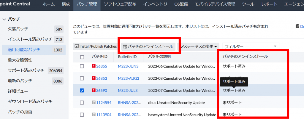 - 上記「C. パッチを指定してインストール済みのPCからアンインストールする」と同様、「パッチのアンインストール」列が「サポート済み」となっていることを確認します。