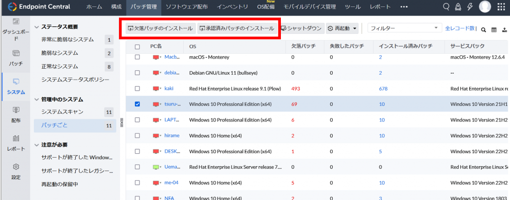 - パッチを配布する対象のPC にチェックを入れ、「欠落パッチのインストール」または「承認済みパッチのインストール」をクリックします。「欠落パッチのインストール」を選択すると、選択したPCで欠落しているパッチが全て選択されます。「承認済みパッチのインストール」をクリックすると、承認ステータスが承認済みとなっているパッチのみが選択されます。