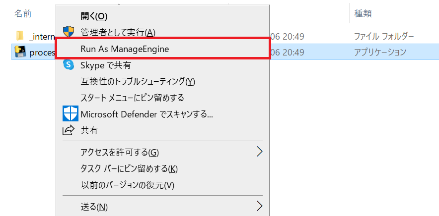 ユーザーはコンテクストメニューから「Run As ManageEngine」を選択することで、対象のアプリケーションを管理者権限で実行することができます。