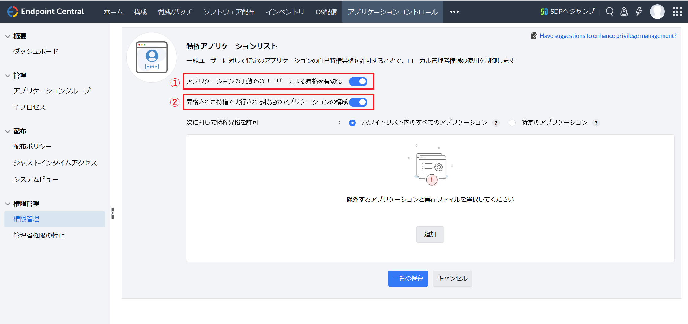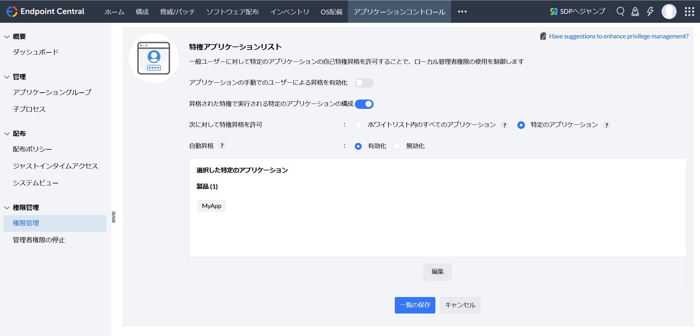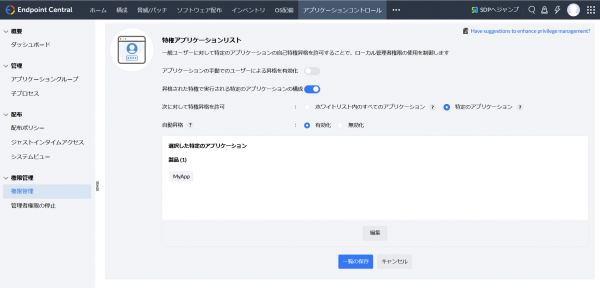 アプリケーション制御の「権限管理」は、ユーザーがアプリケーションを実行する際に、権限を管理者権限へと変更できます。