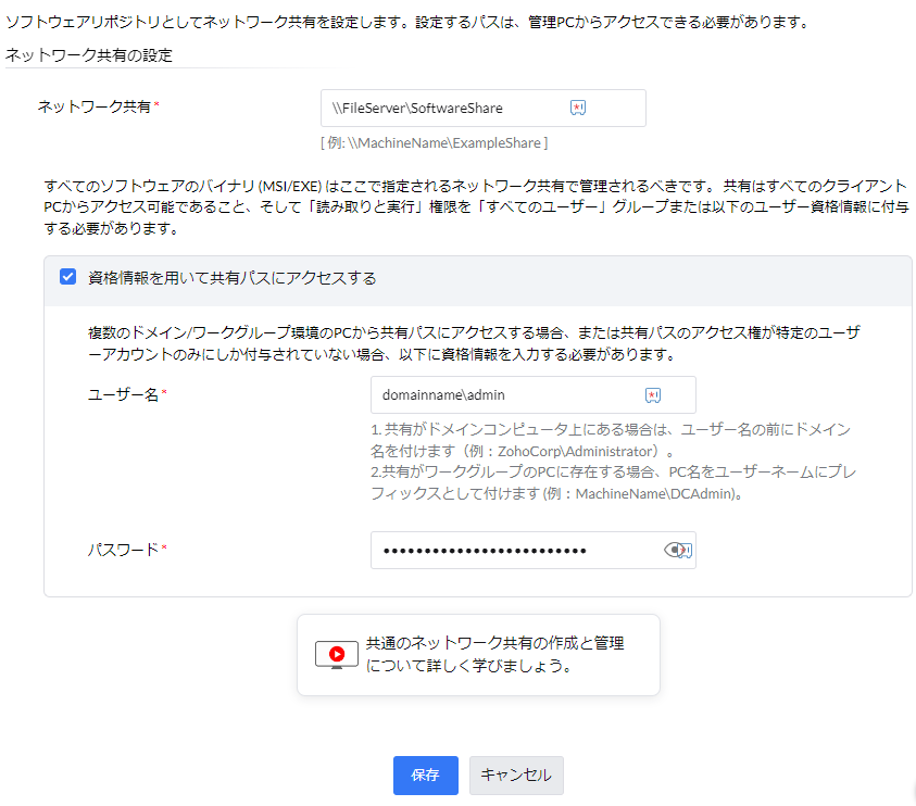 - 「ネットワーク共有」に、共有フォルダーへのパスを入力します。