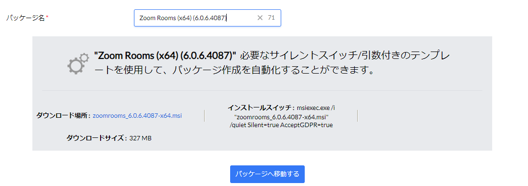 - 「パッケージ名」にソフトウェアの名前を入力すると、テンプレートが利用可能なソフトウェアは選択可能になります。