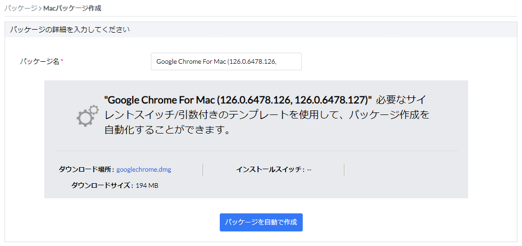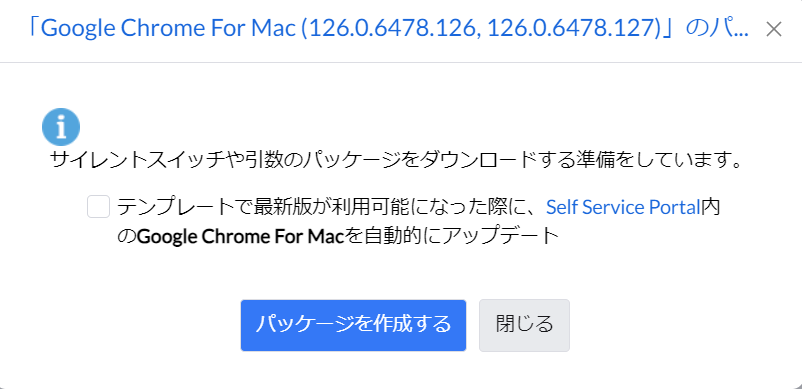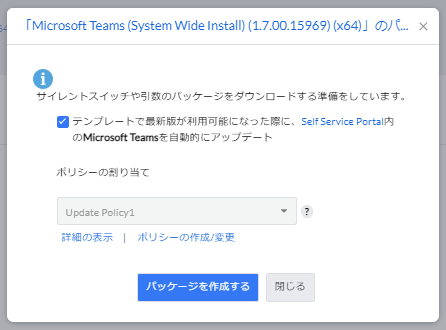 - セルフサービスポータルで公開された場合パッケージを更新: 有効化すると、パッケージをセルフサービスポータルで公開している場合、新しいバージョンのインストーラーが利用可能になったら、その新しいインストーラーを使用したパッケージも自動的にセルフサービスポータルに公開します。