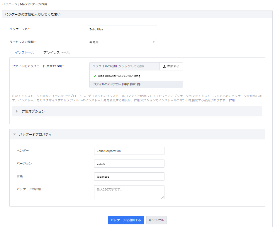 アップロードが中断された場合、カーソルをファイル名に合わせると表示される青い矢印をクリックして再アップロードします。 - インストール/アンインストールの詳細を入力します。必要に応じてインストールの詳細オプションやアンインストール時の詳細オプション、パッケージプロパティについても入力します。
