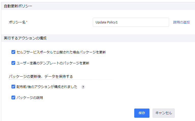 - パッケージの更新後、データを保持する:新しいバージョンで自動作成されたパッケージにも配布前後のアクション、パッケージの説明(セルフサービスポータルの場合のみ)を引き継ぎます。