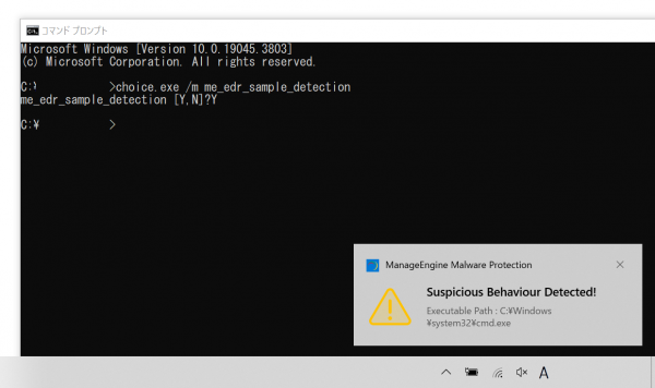 他のソフトウェア等の動作状況によっては通知が即座に表示されない場合がありますが、その場合でも検知自体は行われています。コマンド実行後しばらく待っても通知が表示されない場合、次の手順で示すとおりEndpoint Central Cloudのコンソール画面上にて、マルウェアが検知されていることをご確認ください。