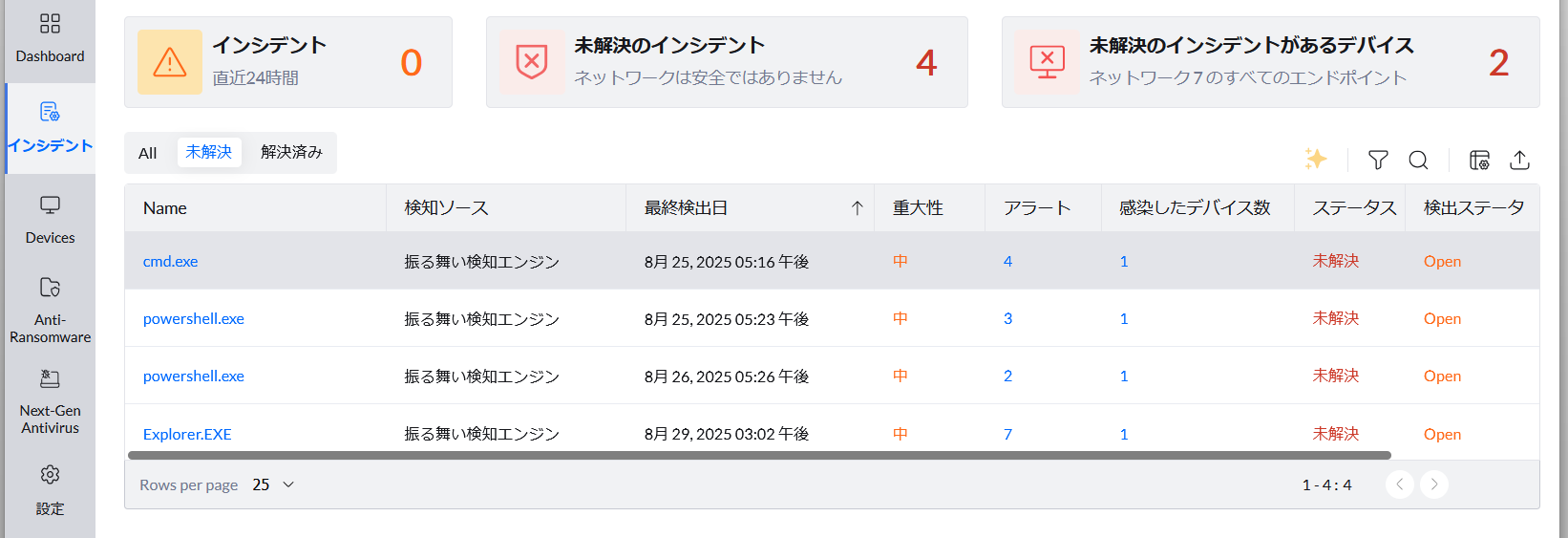 - マルウェアの疑いのあるプロセスが検知されると、「インシデント」へ詳細が表示され管理者へ通知が届きます。