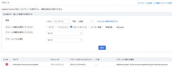 - 「備考」列や「アラート」列において、配信サーバーに関するアラートを確認できます。[管理]タブ → [監査]→[アラート]においても、アラートの種類として配信サーバーに関するものを選択することで、アラートを確認できます。