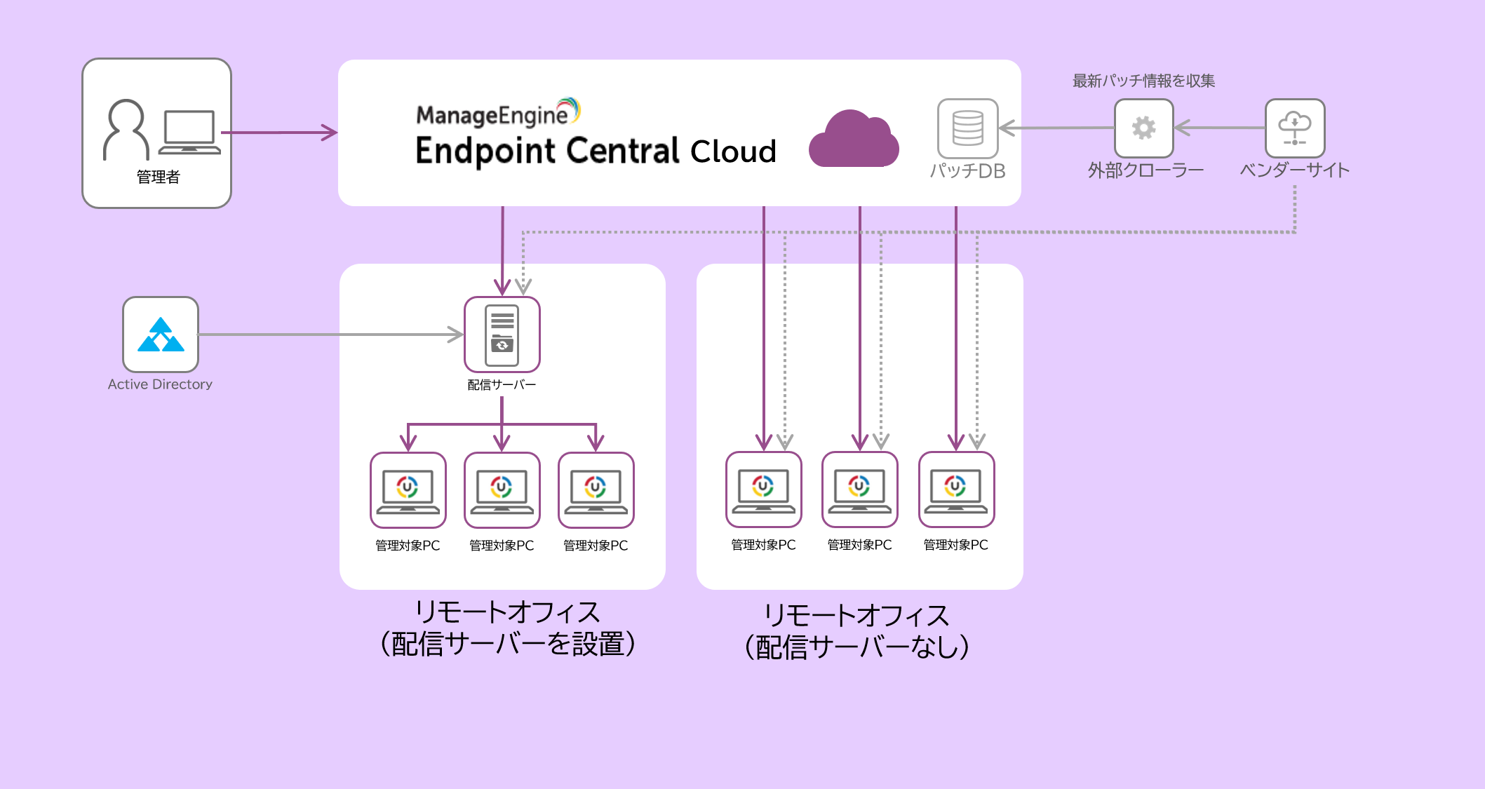 配信サーバーの主な役割は、Endpoint Central Cloudのサーバー(Zohoが管理しているサーバー)やその他ベンダーのサーバーから