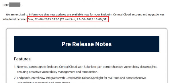 エージェントや配信サーバーのアップグレードを伴うEndpoint Central Cloudの更新に対して、事前にメールを通知します。
