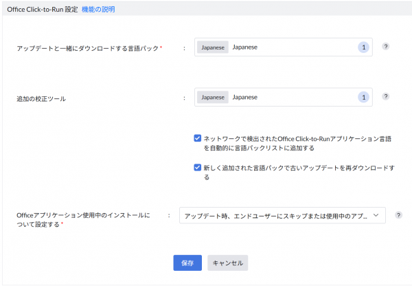 - アップデートと一緒にダウンロードする言語パック: 管理対象で検出された言語が表示されています。日本語環境においては必ず「Japanese」が選択されているため、そのままにします。必要に応じて、Officeに追加したい言語パックを入力/不要な言語パックを削除します。
