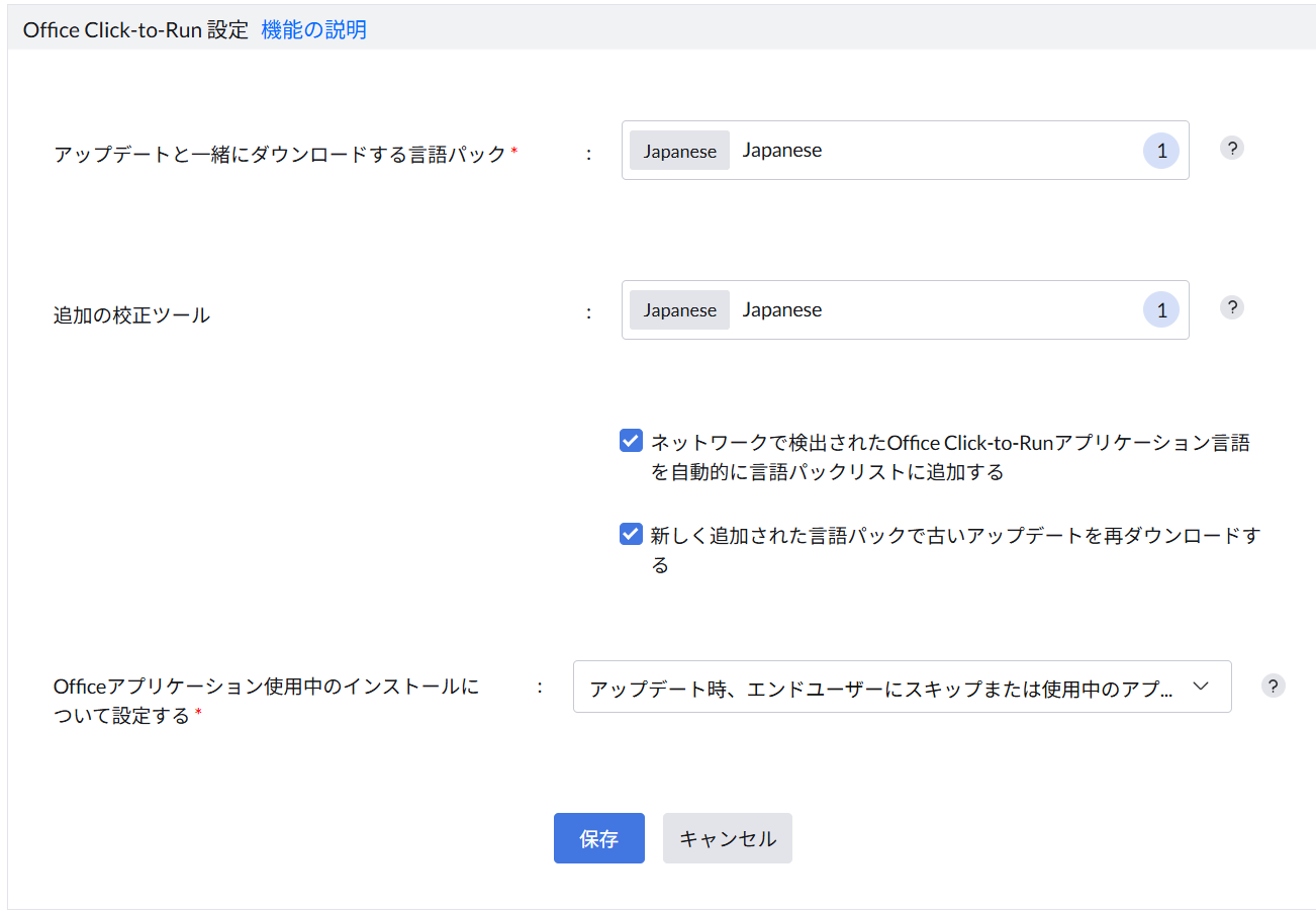 - 「ネットワークで検出されたOffice Click-to-Runアプリケーション言語を自動的に言語パックリストに追加する」: 新たな言語を検出した場合、Click-to-Run設定を手動で変更しなくても済むよう、言語パックを自動的に追加する場合はこの項目にチェックを入れます。