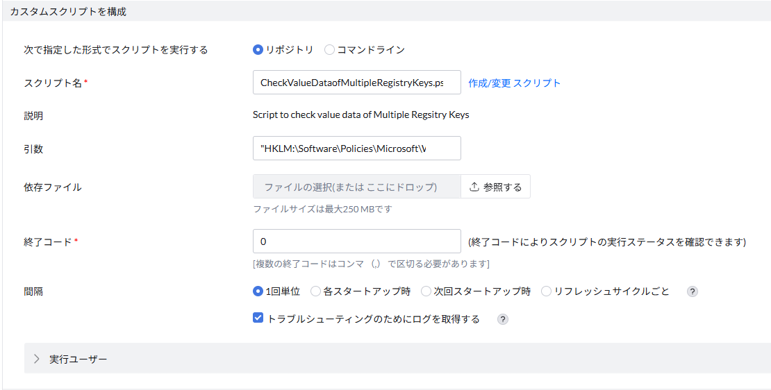 - 次で指定した形式でスクリプトを実行する:「リポジトリ」をクリックし、「スクリプト名」の欄から「CheckValueDataofMultipleRegitryKeys.ps」を選択します。