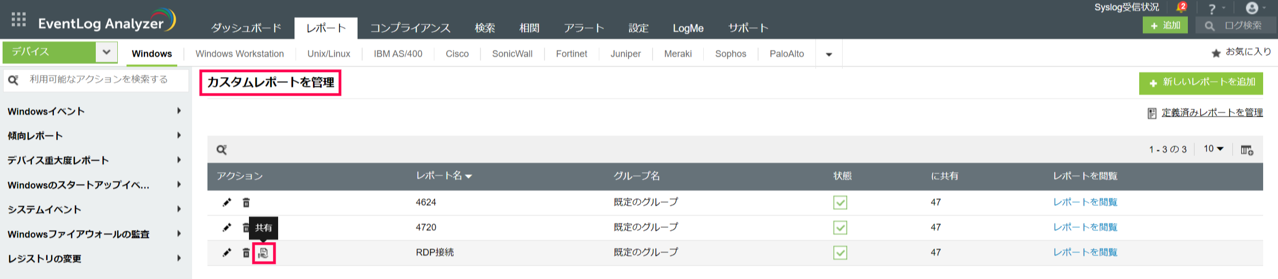 役割が「管理者」のユーザでEventLog Analyzerにログインして、カスタムレポートを作成しました。
