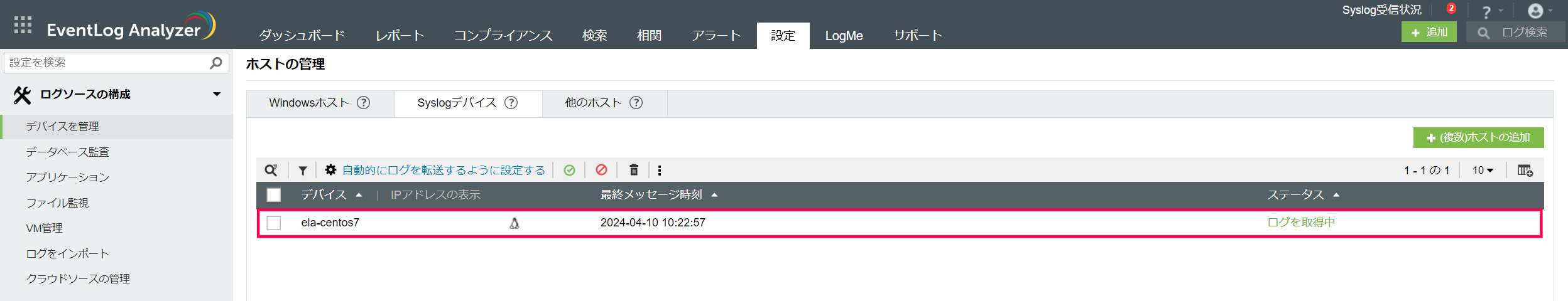 自動追加されたSyslogデバイスは、[設定]タブ → [ログソースの構成] → [デバイスを管理] → [Syslogデバイス]タブに表示されます。