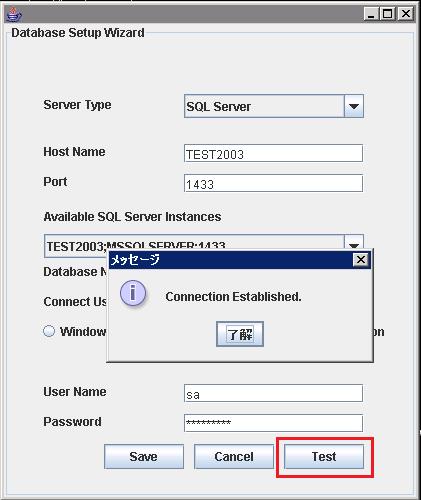5. 「Test」ボタンをクリックして、接続を確認します。「Connection Established」というメッセージが表示されることを確認します。