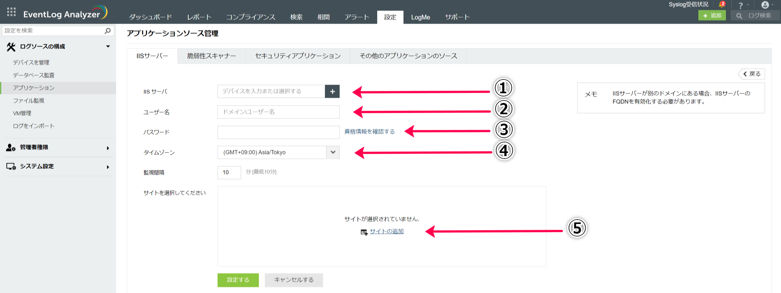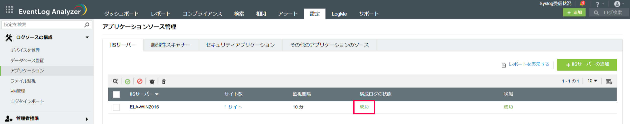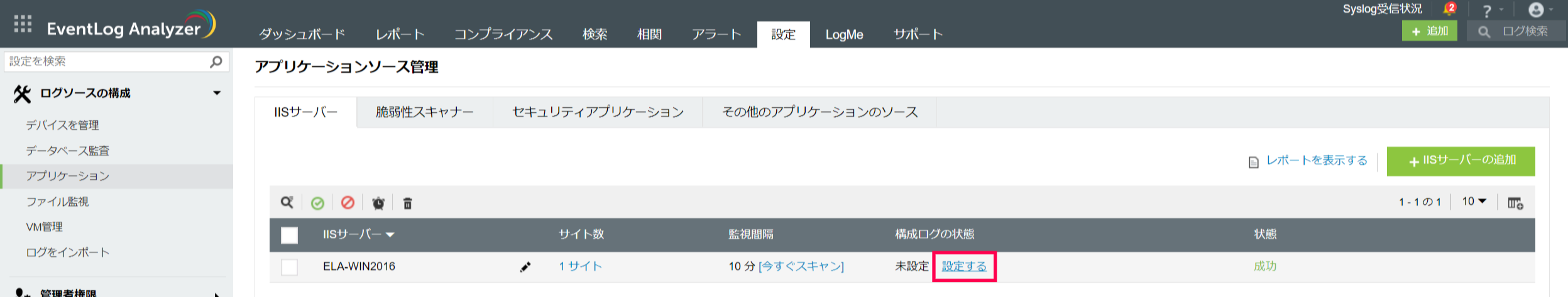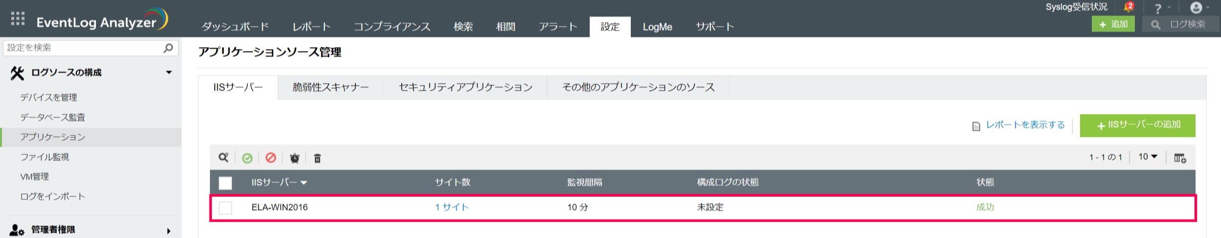 - [設定]タブ → [ログソースの構成] → [アプリケーション] → [IISサーバー]タブに移動します。