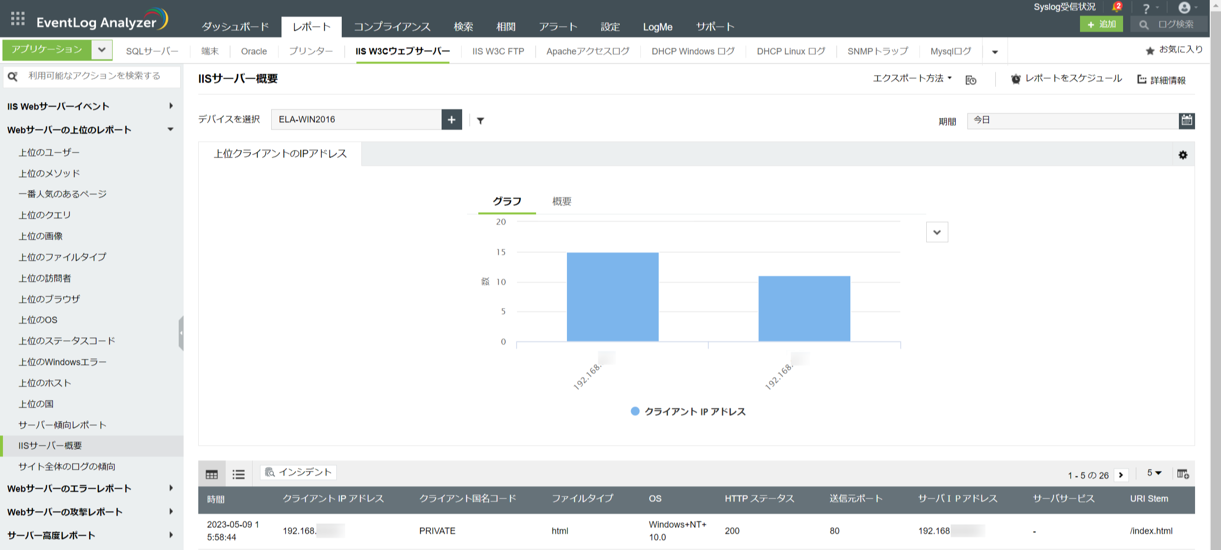 IISログ監視機能を使用することで、Microsoft IISのWebサーバー/FTPサーバーで発生したWebページの表示エラーや、ユーザーによるアクセスの記録、権限のないファイルへのアクセス試行などのイベントを監視することが可能です。