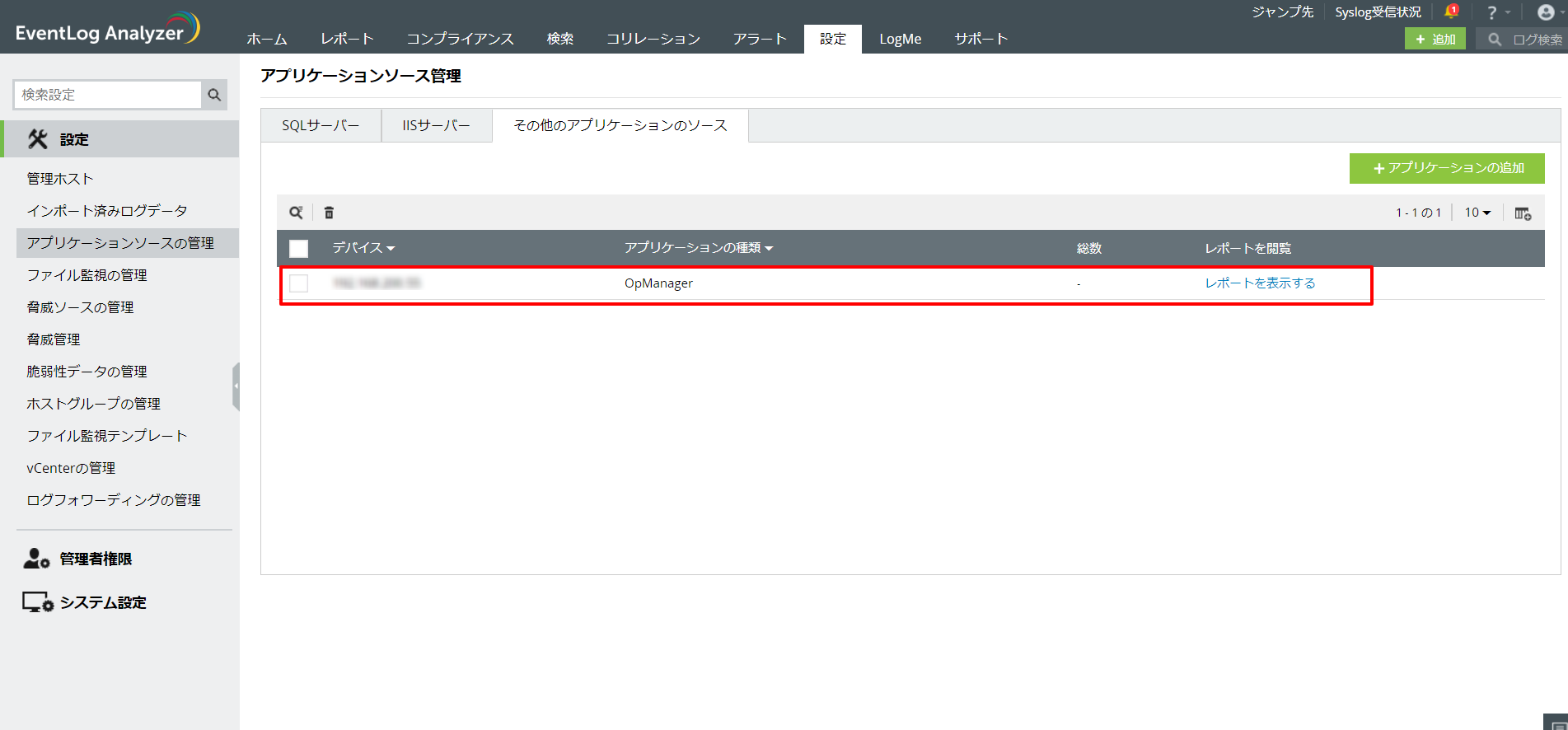 [アプリケーションの種類] >> ManageEngine Apps >> OpManager [デバイス] >> ELAに登録済みのOPMのUnixホスト4. 追加後、以下のようにOPMホストがアプリケーションホストとして、ELAに登録されます。