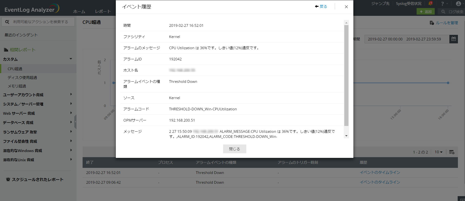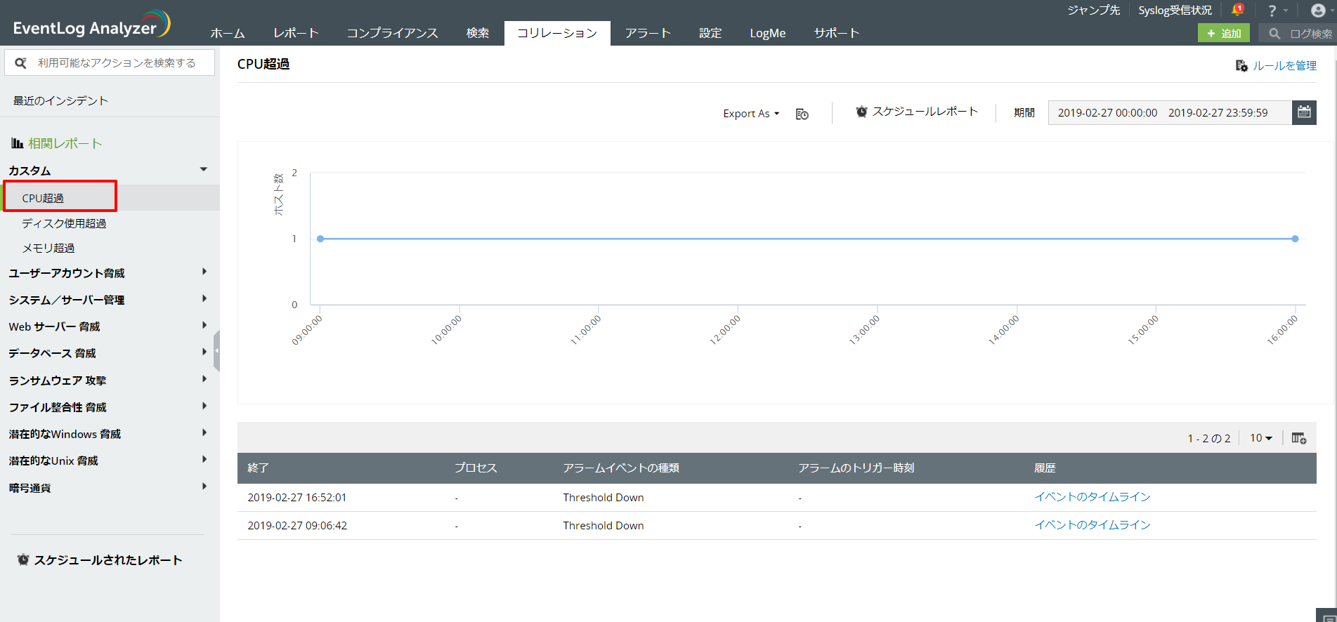 ※以下、「CPU超過」のカスタムルールを作成した場合のレポート画面となります。