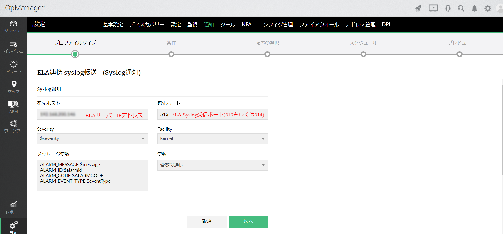 1. OPMからELAに対するSyslog転送設定を実施 (※Syslog通知プロファイルを使用)