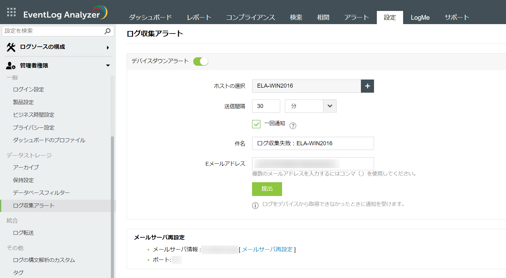 送信間隔を「30分」と設定した場合、対象のデバイスから30分間連続でログ収集が失敗するとアラート通知が行われます。