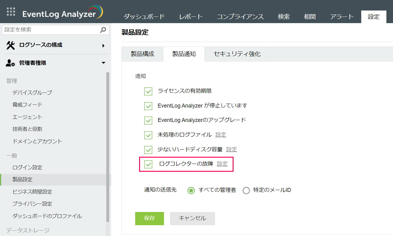 - [設定]タブ → [管理者権限] → [ログ収集アラート]へ移動します。