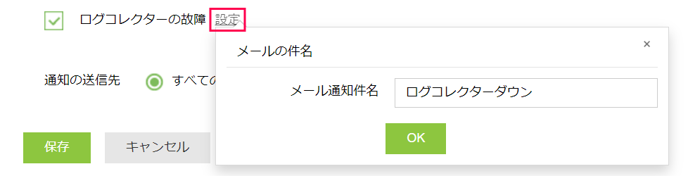 [一回通知]にチェックを入れた場合は、最初のアラート通知から30分間連続でログ収集が失敗していても、2回目以降のアラート通知は行わなくなります。 - [件名]に通知メールの件名を指定します。