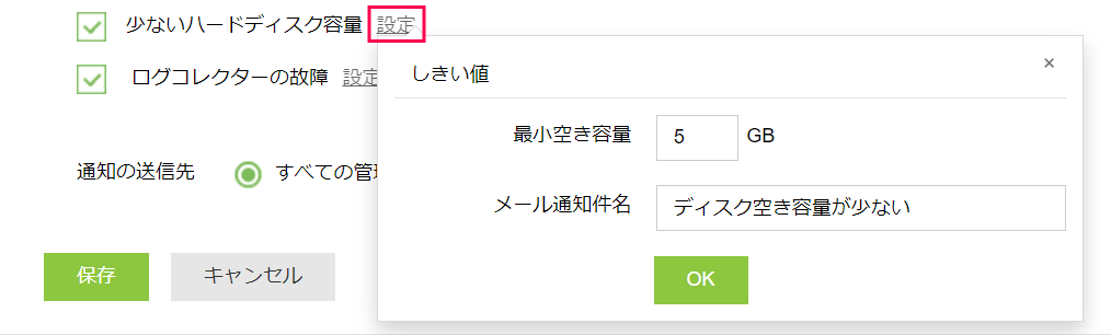 ディスク空き容量が指定のしきい値を下回った場合にメールによるアラート通知を行います。
