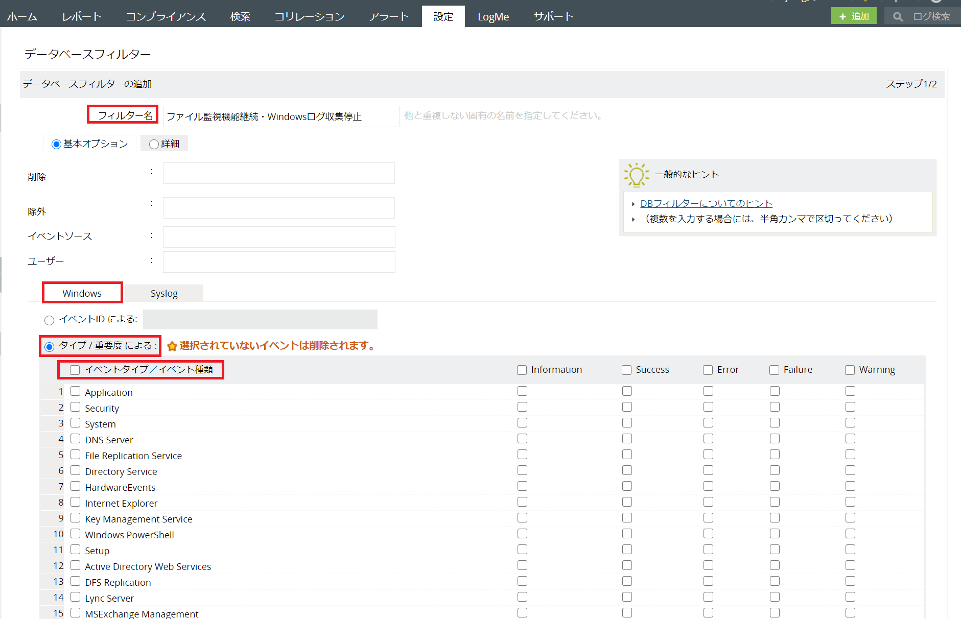 以下、ログフィルターを設定することで、ファイル監視は継続させながらWindowsログ収集を停止する手順をご紹介します。