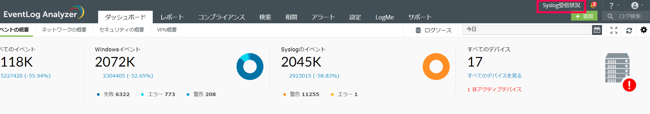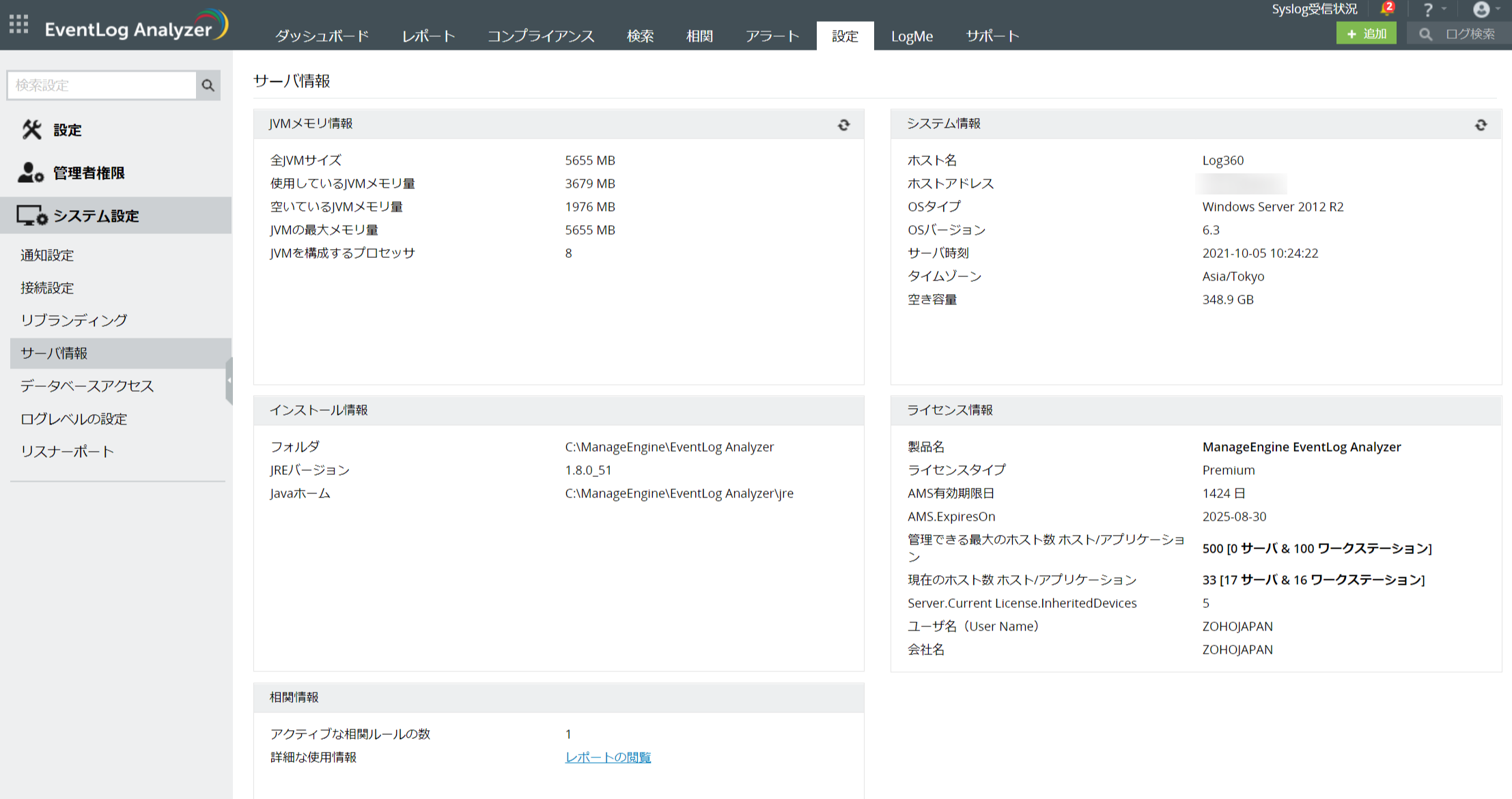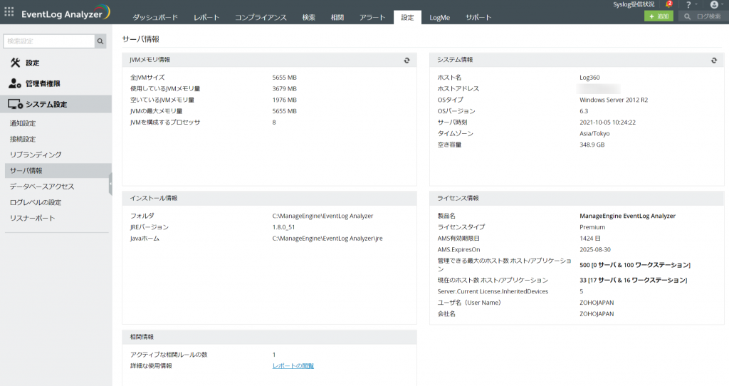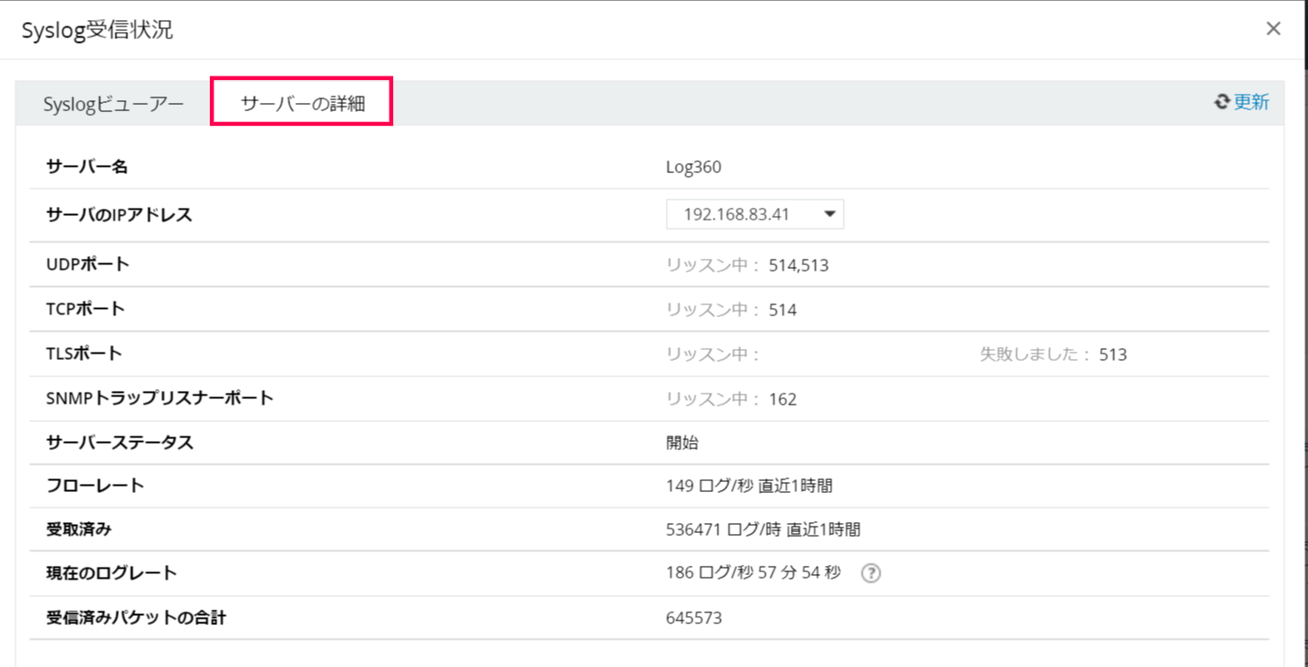 サーバ情報を確認する 作成日:2015年9月2日 | 更新日:2022年11月17日 設定と操作 本ナレッジでは、フローレート(ログ流量)やリスニングポートなどの「サーバ情報」を確認する手順をご説明します。 手順 1. 製品にログイン後、画面右上の [Syslog受信状況] をクリックします。 2. [サーバーの詳細]タブにて、フローレートやリスニングポートが確認できます。 3. より詳細な情報を確認したい場合、[設定] → [システム設定] → [サーバ情報] に移動することで確認可能です。 以上です。 このナレッジの総閲覧回数: 1,149 関連ナレッジ: 通知「CachedRecord Limit Exceeded」の概要 アーカイブデータの保存先パス変更手順 適用されたライセンスの確認方法 インシデント管理機能の概要および設定手順