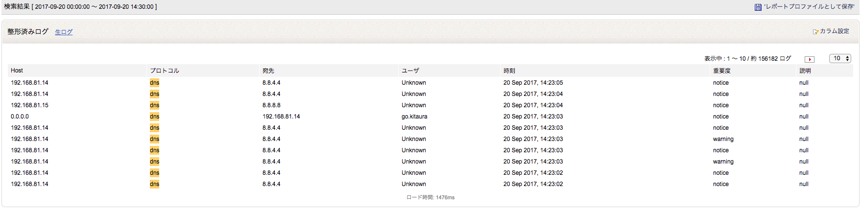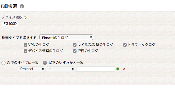 - 検索対象の装置を選択後、検索タイプ「Firewallの生ログ」を指定