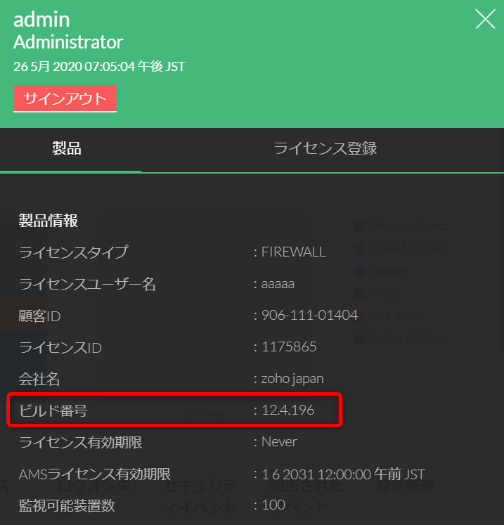 - [製品]タブより、ビルド番号が更新されていることを確認