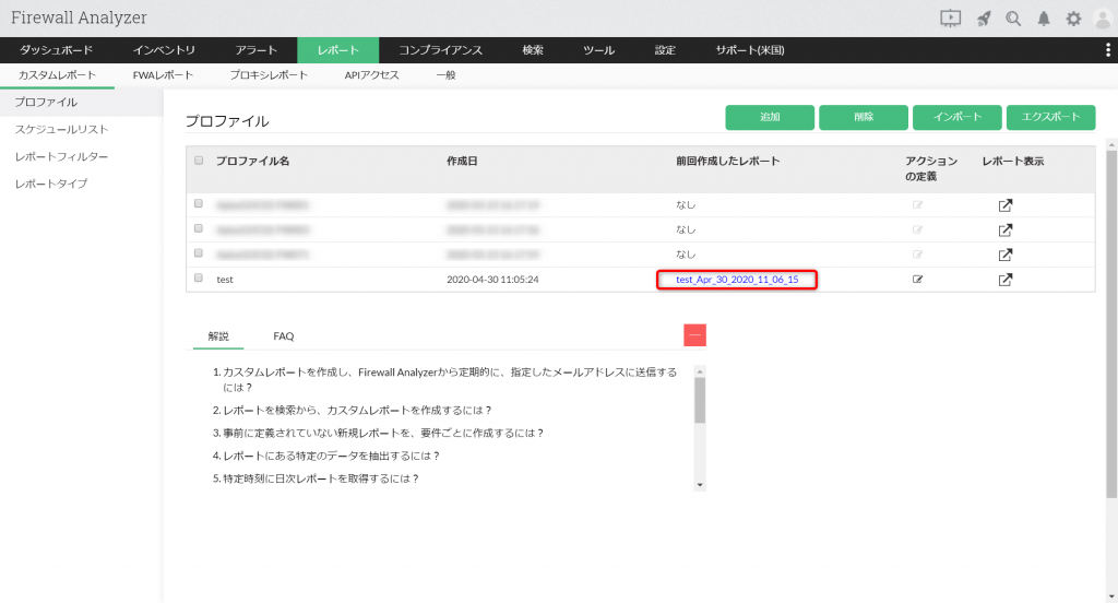 作成されたレポートは、[レポート]→[カスタムレポート]→[レポートプロファイル]画面の