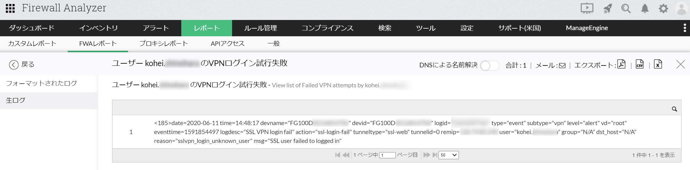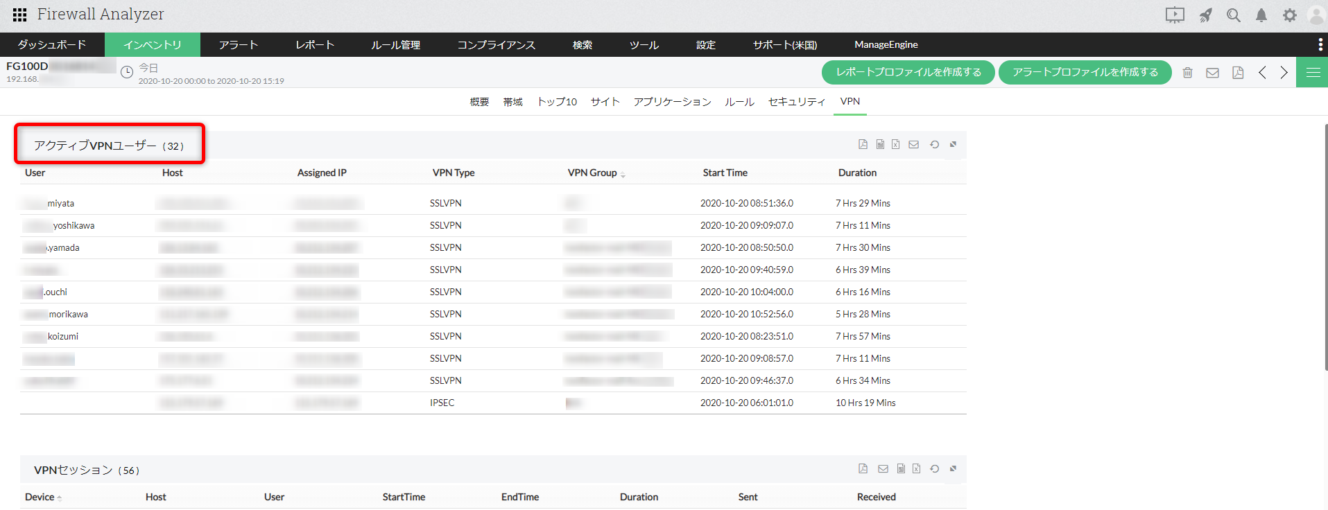※[VPN Sessions]レポートの場合、ActiveなVPNユーザーもレポート内に表示されます。
