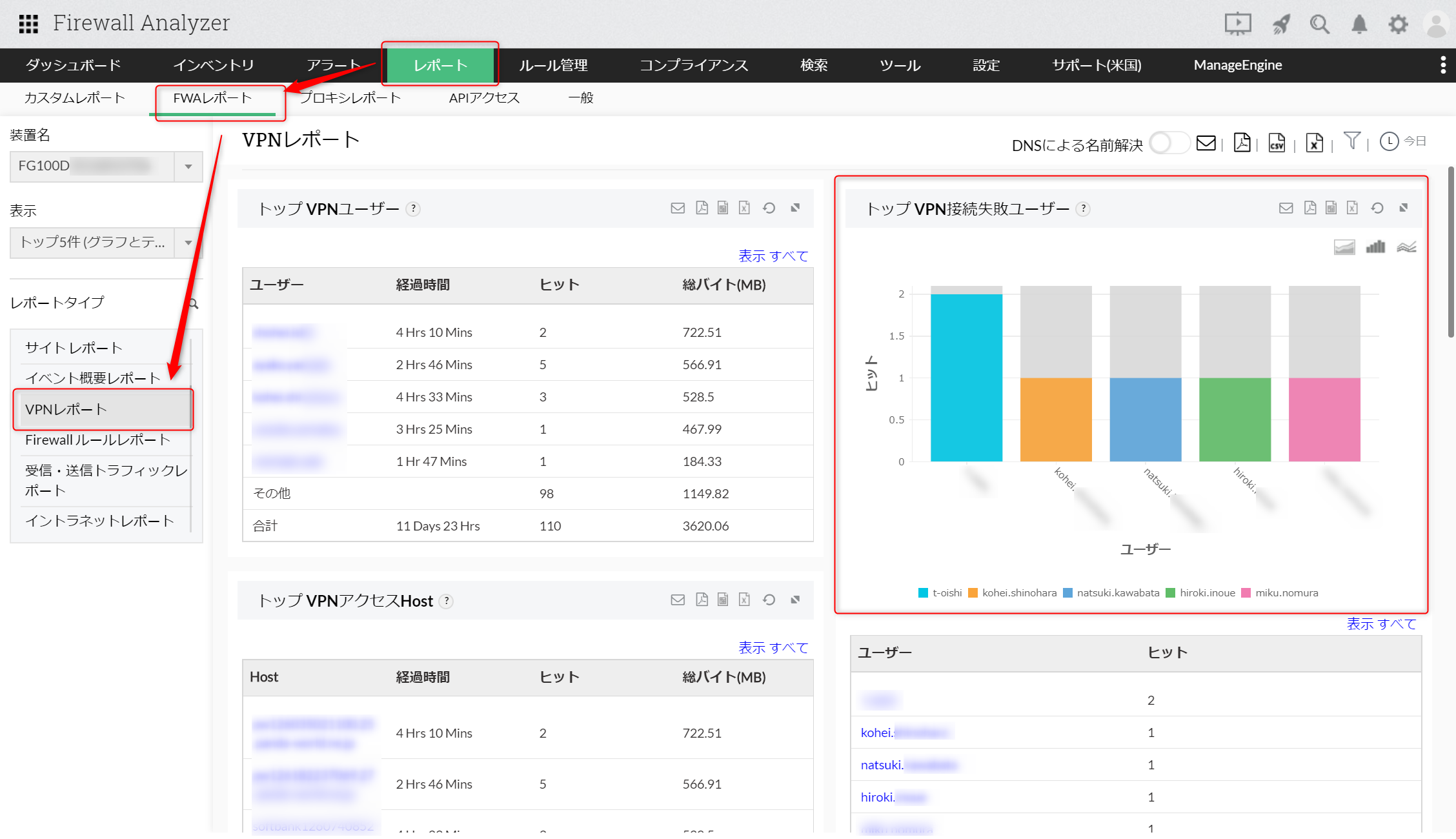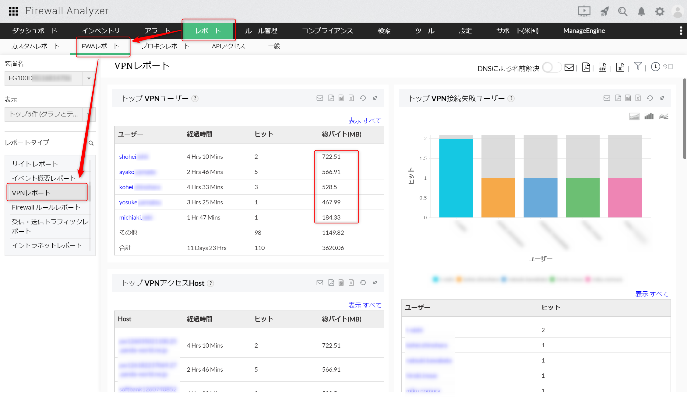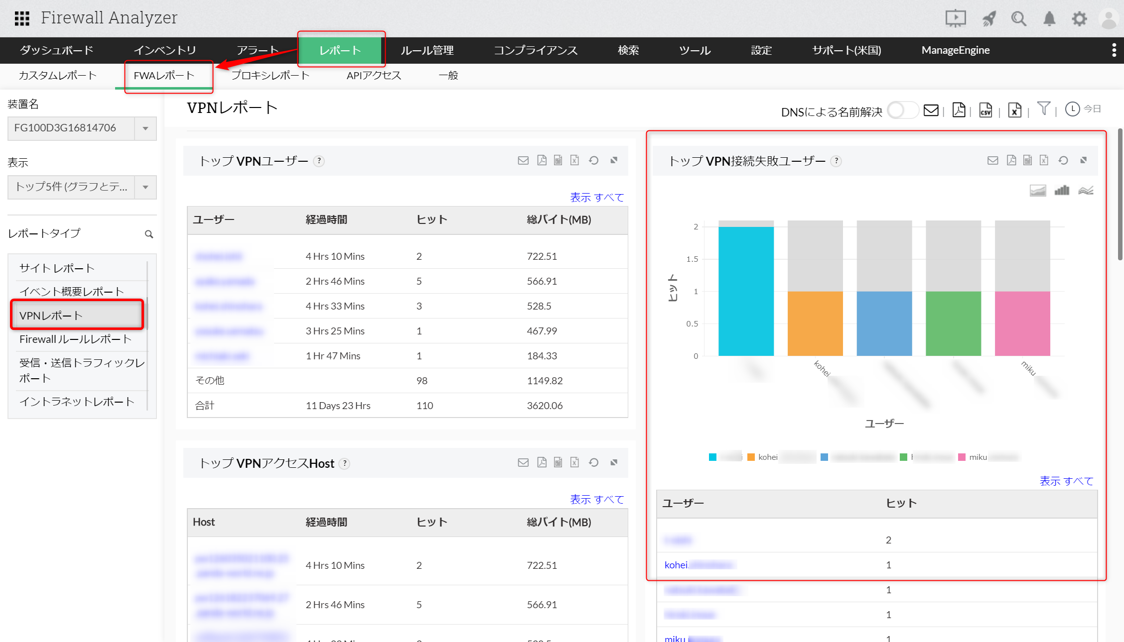 - [レポート]→[FWAレポート]画面に遷移し、対象機器とレポートタイプ[VPNレポート]を選択