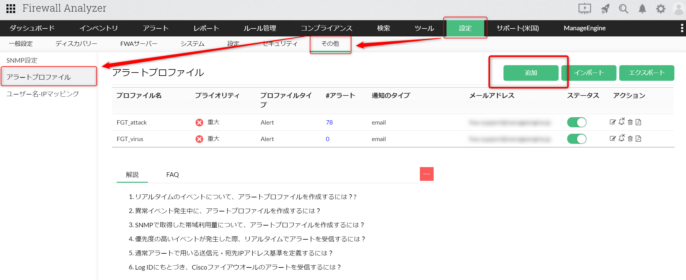 - [設定]→[その他]→[アラートプロファイル]画面より、VPN通信に関するプロファイルを設定