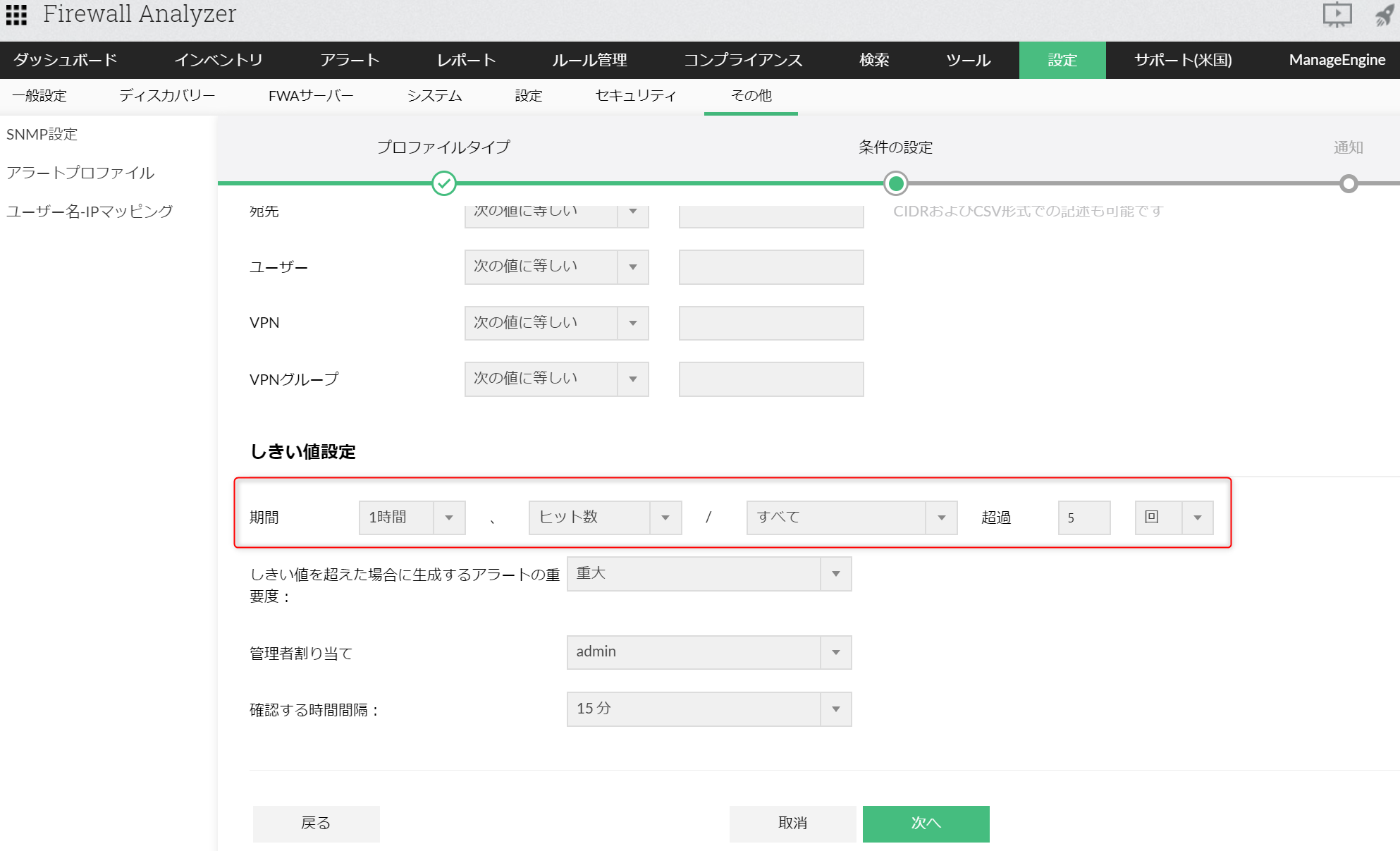 ※今回は例として、1時間に5ヒットした場合に発報する設定をします。