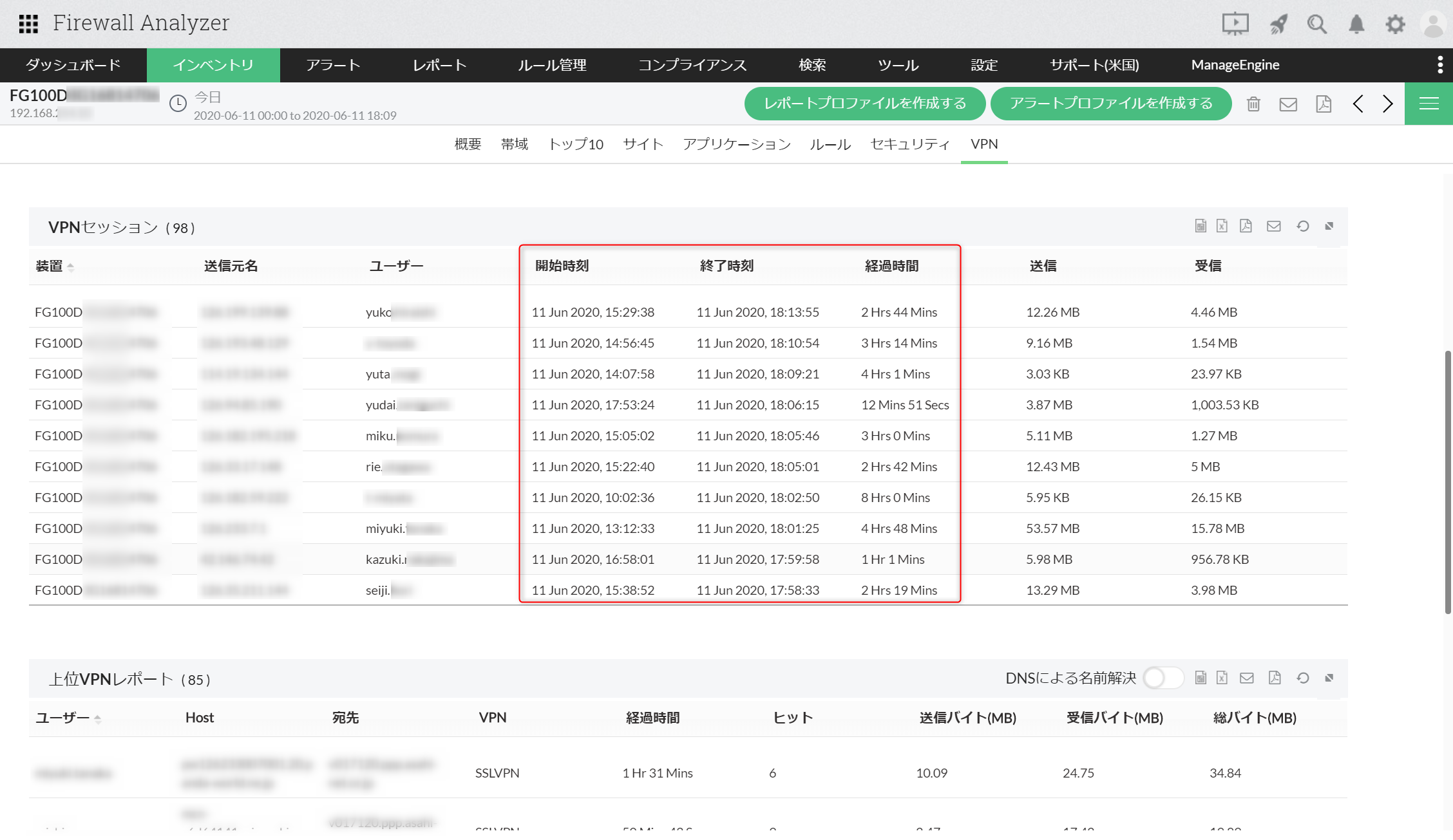 - 項目 [VPNセッション]より、各ユーザーのVPNセッション開始/終了時刻を確認