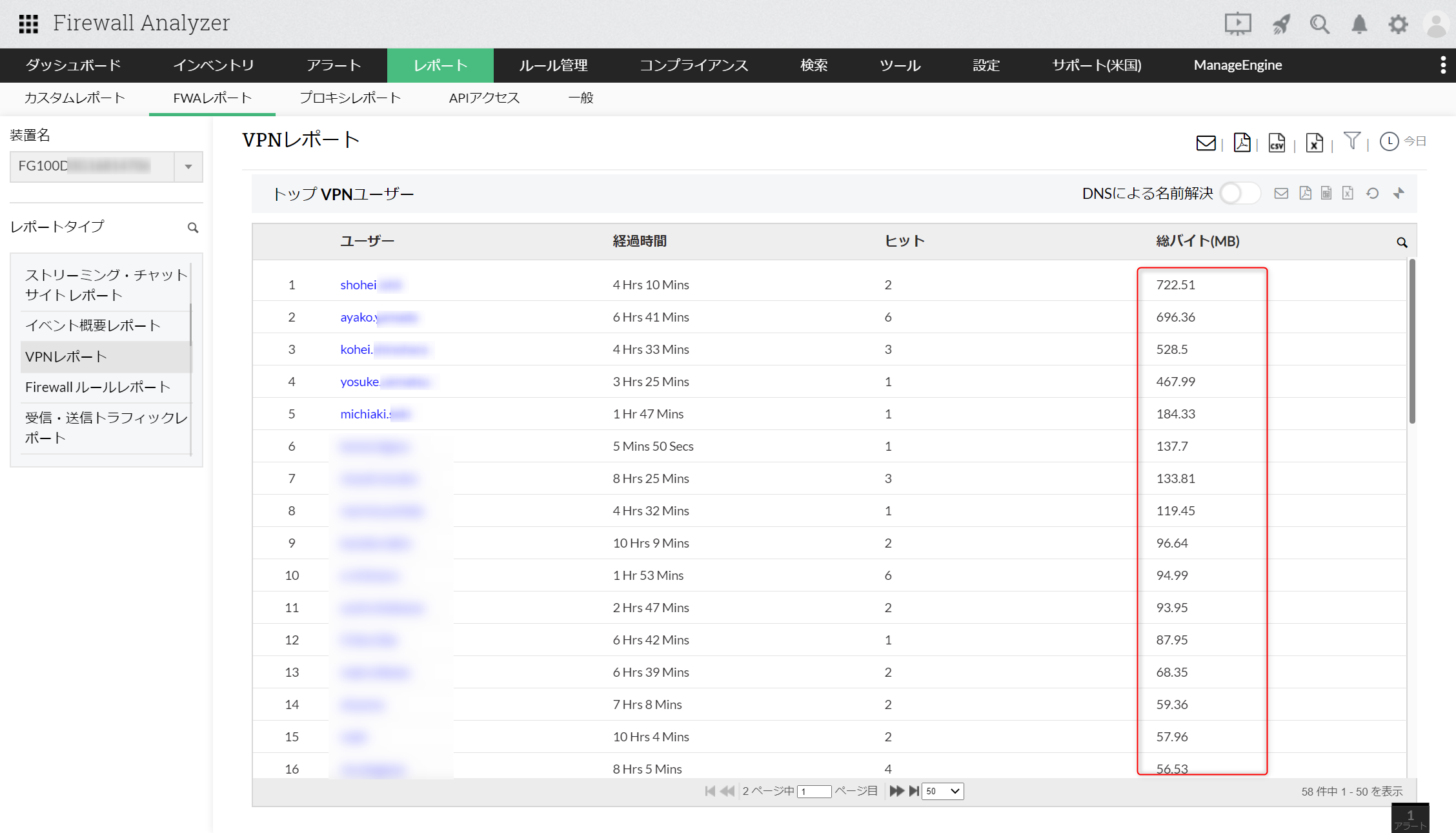 ※ビルド12.5.150をご利用の場合、[レポート]→[VPNReports]→[VPNレポート]の[トップVPNユーザー]をご参照ください。