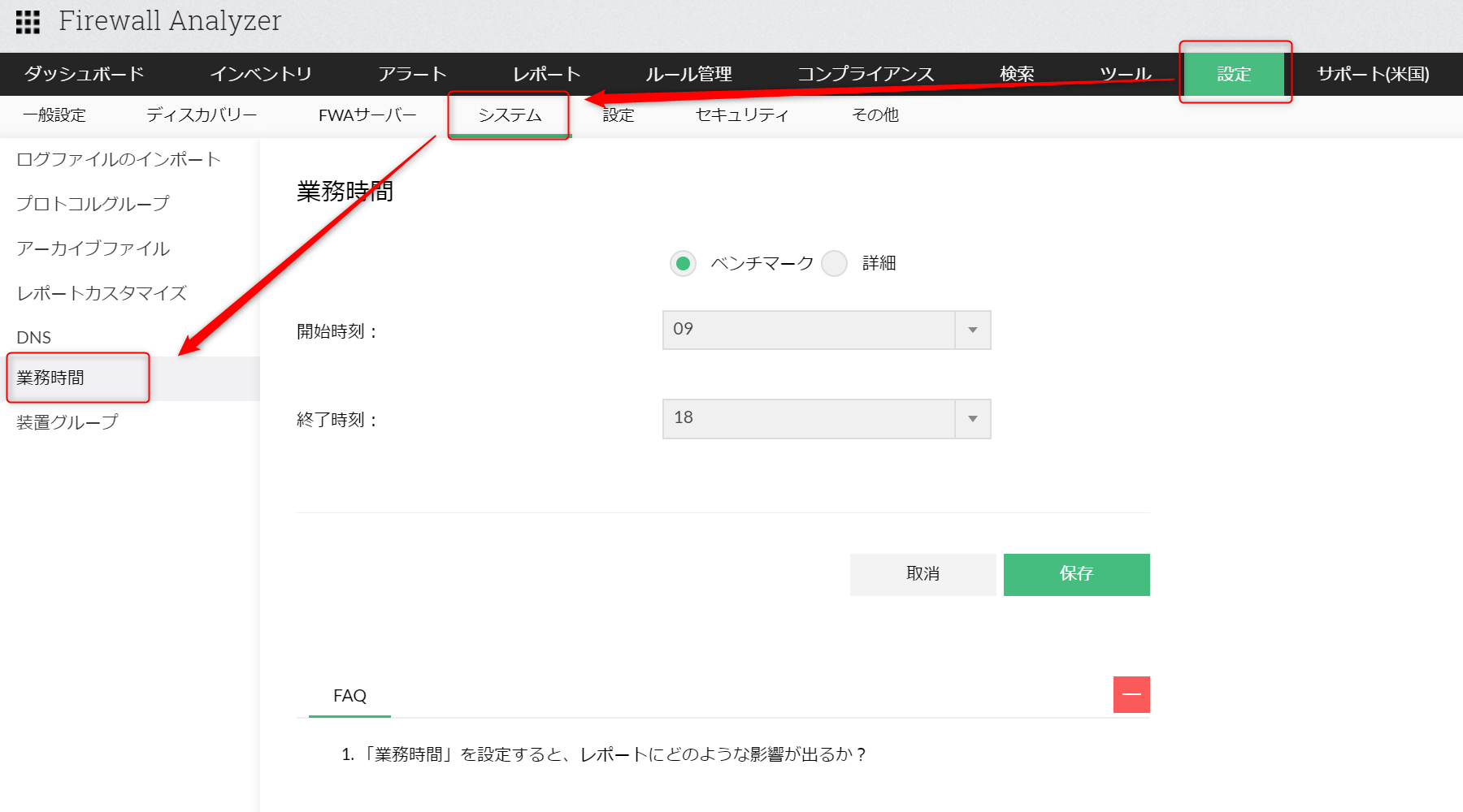 [設定]→[システム]→[業務時間]画面に遷移し、開始/終了時刻を入力し保存