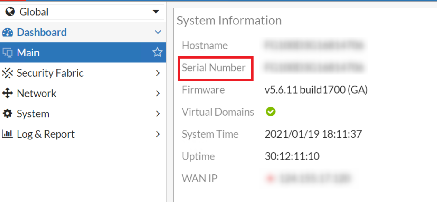 - プライマリ機のWebコンソール上で、シリアル番号を確認(Dashboard > Main)