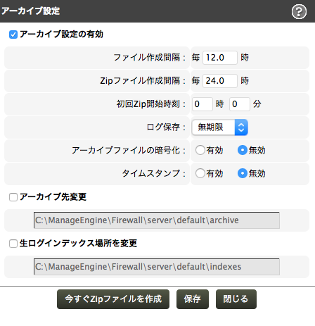 また、アーカイブファイルの作成間隔(デフォルト:12時間)、Zipファイル作成間隔(デフォルト:24時間)ならびに、