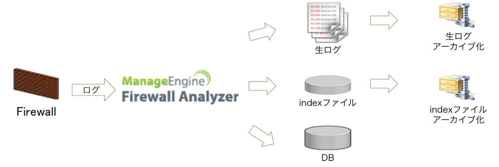 Firewall Analyzerが受信したログデータと各機能で使用するデータとの関係、および保存期間設定との関係について記載します。